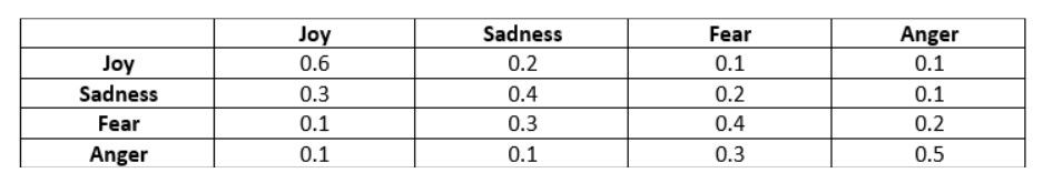 If she is sad, there's a 30% chance she'll be joyful tomorrow, a 40% chance she'll remain sad, a 20% chance for fear, and a 10% chance for anger. And so on for each emotional state.