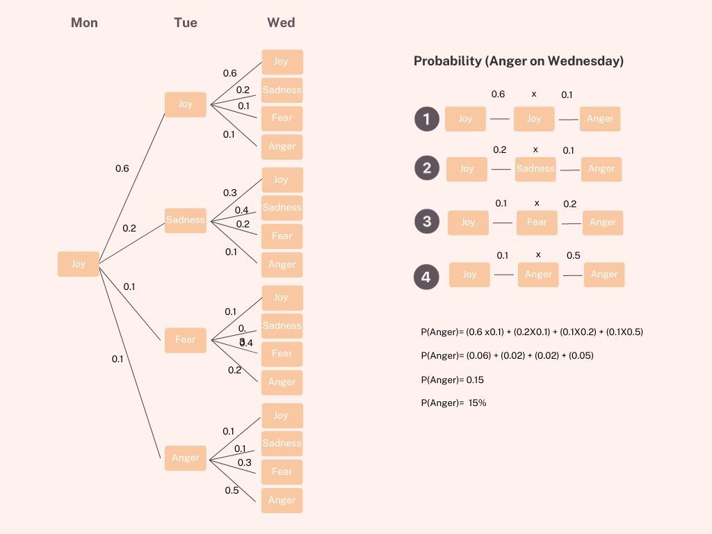 In the diagram below, I've transformed the transition matrix into a tree diagram to help us figure out the probability of Danni being angry on Wednesday. There are four distinct pathways that lead to this outcome. We'll compute the probability for each of these paths and then sum them up to arrive at the overall probability, which, as it turns out, is a mere 15%. So, the odds are in your favour – no need to dodge Danni at the office! 😅