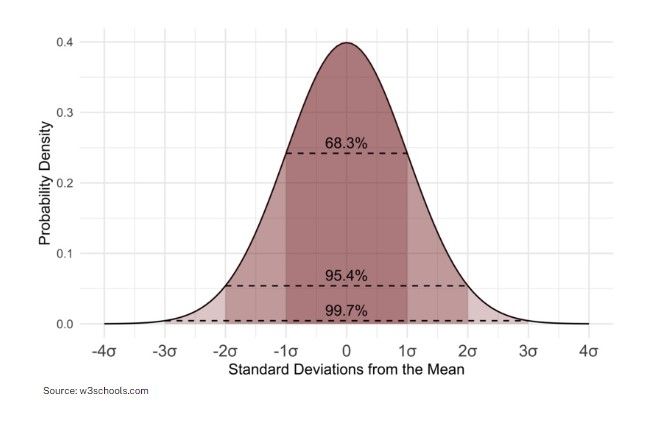 Statistical method is one of the most straightforward approaches to anomaly detection. It involves calculating the mean (average) and standard deviation (which measures the dispersion of data from the mean) of the data. Any data point outside a certain range is considered an outlier, usually 2-3 standard deviations (σ) from the mean. In a normal distribution (aka Gaussian distribution), it is expected that the majority of the values will fall within 2-3 standard deviations from the mean.
