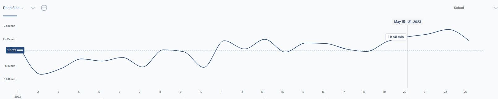 Examining the two charts, I see the amount of REM sleep is dipping slightly, and deep sleep is increasing. Looking at the 20th to 22nd week of 2023 (15th May to 4th June), can you guess why my deep sleep has gone up?