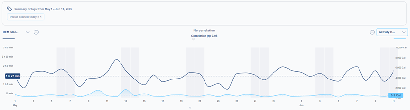 As you can see from the line chart above, the analysis reveals that there is no correlation between burning more calories during exercise and longer REM sleep. The correlation value is 0.08, indicating a negligible relationship. Correlation ranges from -1 to 1, where -1 signifies an inverse relationship, 1 indicates a positive correlation, and values close to 0 indicate no correlation.
