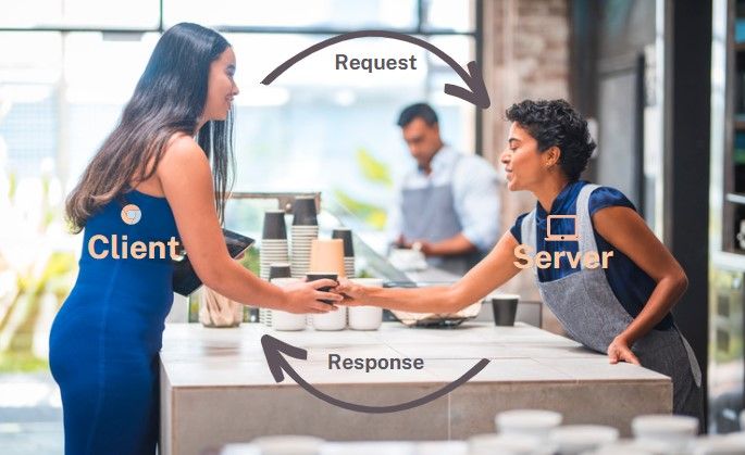 The two together are known as the client-server model. The Client requests a service, and the Server provides the service. So, when we press that ENTER button, our browser sends a message to the Server and says, "Hey, give me the home page of this website, please", and the Server will send a message in response to the request. The first message is the HTTP request, and the second message is the HTTP response.