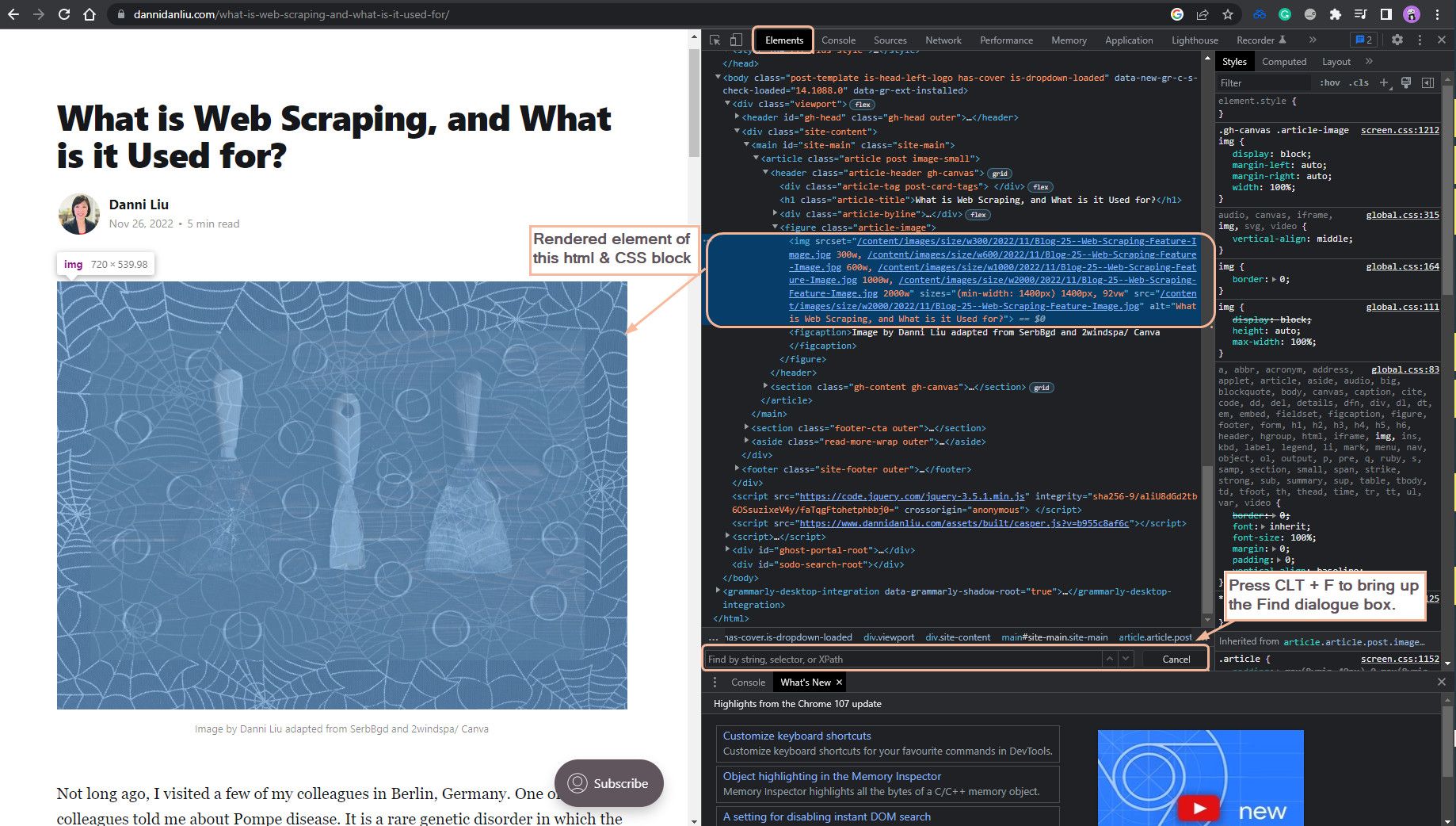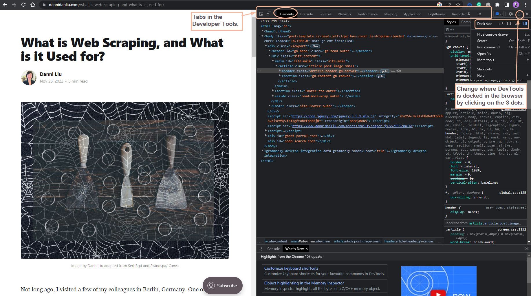 Recall in the previous blog that one of the steps involved in web scraping is inspecting the webpage. What we are inspecting is the DOM in the Developer Tools (DevTools).