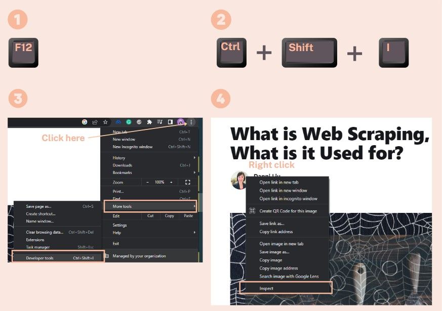 For web scraping, I recommend using method 4: right-click on an element and select inspect. Generally, we are only interested in scraping an aspect of the web page. By right-clicking on the object you are interested in on the web page and selecting inspect, it takes you directly to that element in DOM when the DevTools opens. You don't have to waste time trying to locate it.
